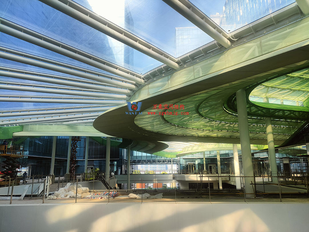 博多森谷項(xiàng)目中庭鋼膜結(jié)構(gòu)工程位于余杭區(qū)良渚板塊,地處杭州城北,良渚未來(lái)核心區(qū),城西科創(chuàng)大走廊輻射圈。該項(xiàng)目用鋼量約689噸,ETFE+網(wǎng)格織物膜展開(kāi)面積12000平方米。