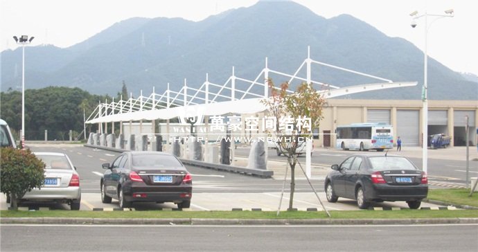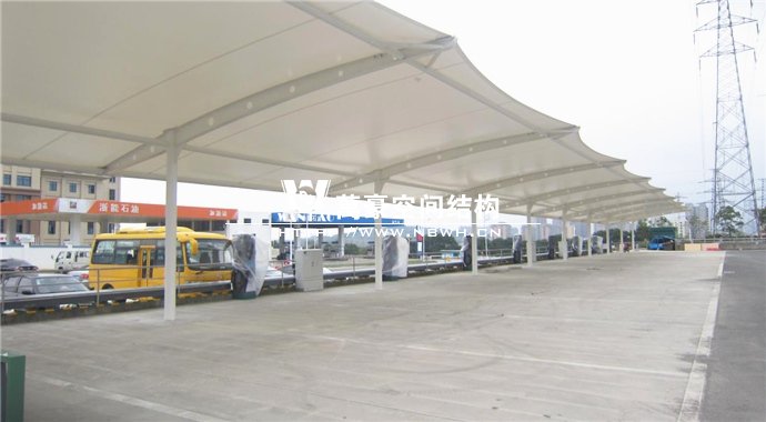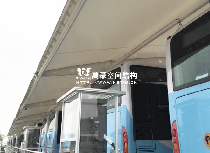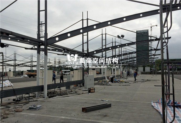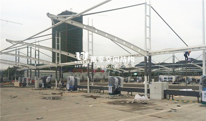 膜結構雨棚施工面積約5138平方;用鋼量約80噸。施工難點在于工期緊。施工時天氣情況差,連續的陰雨天給鋼構的油漆施工帶來了極大的麻煩并且延誤了工期。雨棚底下還要安裝充電樁,我們還要和充電樁施工班組進行技術對接,規劃充電樁的安裝位置。由于工期緊,天氣狀況差,我們動用了兩個施工班組加班加點,土建、鋼構交叉施工,最后如期完工。由于每個雨棚長度比較長,施工班組在立好鋼構件之后從中間開始往兩邊安裝膜布,使工作效率有了很大的提高。
