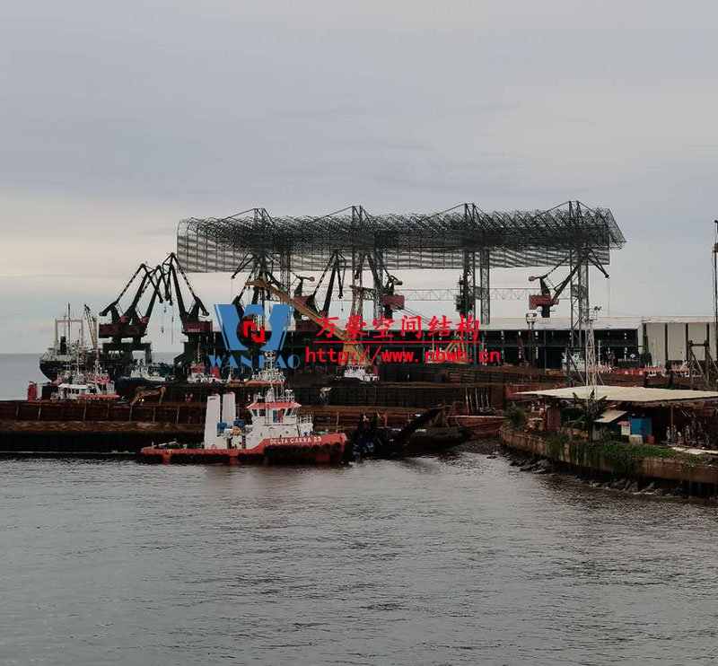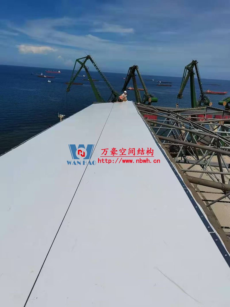印尼全天候碼頭倉庫屋面膜結構工程高度55米,跨度160米,采用鋼結構地面整體拼裝,分區域整體起吊的安裝方式,鋼用量總共2000噸,膜結構展開面積30000平米,屋面膜結構工程由寧波萬豪空間結構工程有限公司承建。