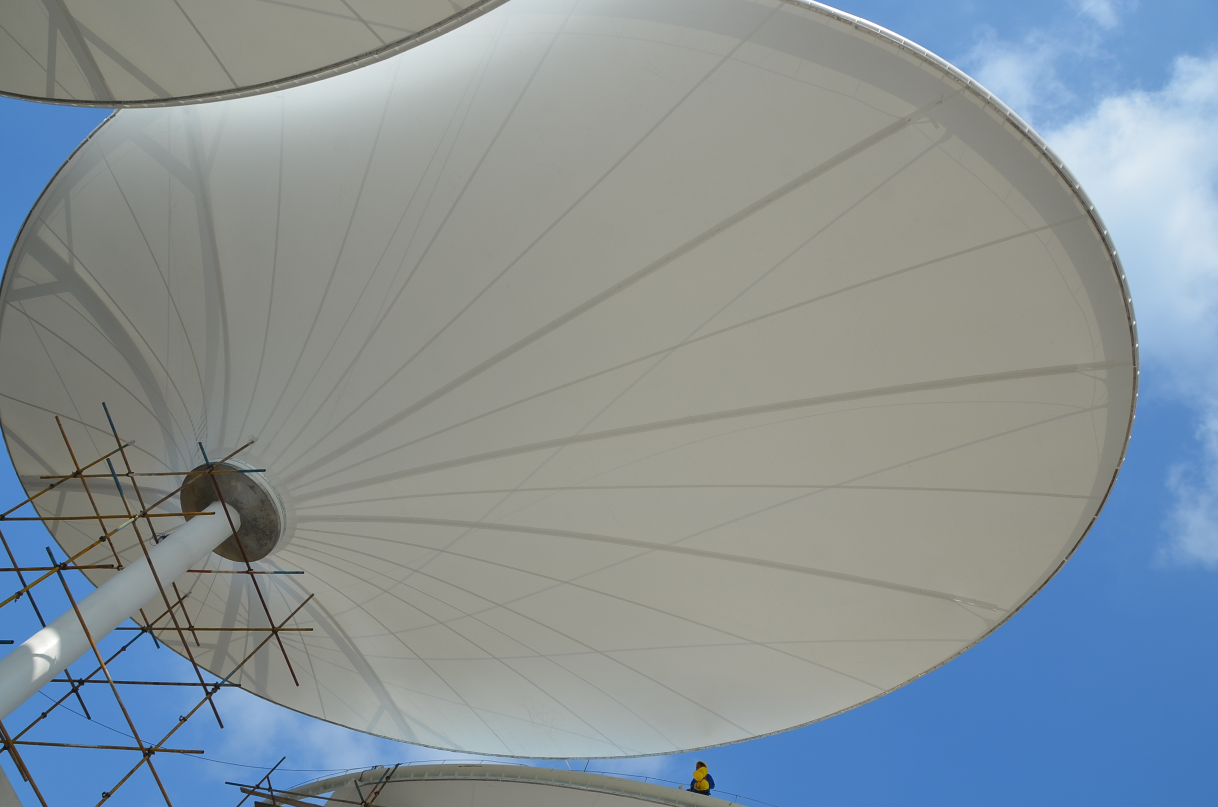 常州大學西太湖校區體育看臺膜結構項目位于常州市延政西路與豐澤路交叉口 (常州大學西太湖校區體育場內)。該工程鋼結構用量153噸、膜展開面積3500㎡,膜材采用進口法拉利膜材。目前鋼結構部分已經全部完成,鋼柱頂標高37米,由7個橢圓單體組成。橢圓長邊方向直徑29.8米,短邊方向直徑18.2米,每個橢圓單體鋼鉤重約22噸,鋼結構鋼柱子內灌滿混凝土